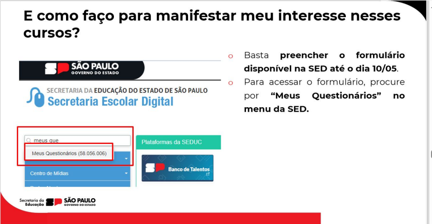 Está aberta na SED a opção dos alunos da atual Primeira Série do Ensino para indicarem sua preferência de Itinerários Formativos para a Segunda Série em 2025. Cada aluno pode indicar até 3 Itinerários Formativos. O prazo para responder ao questionário na SED é até o dia 10 de maio. Não perca o prazo!!!